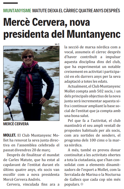 El Club Muntanyenc Mollet ha renovat la seva junta directiva en líassemblea celebrada el passat divendres 20 de març. Desprès de finalitzar el mandat de Carles Matute, que ha estat al capdavant de líentitat durant els últims quatre anys, els socis van escollir com a nova presidenta Mercè Cervera Andrès.
