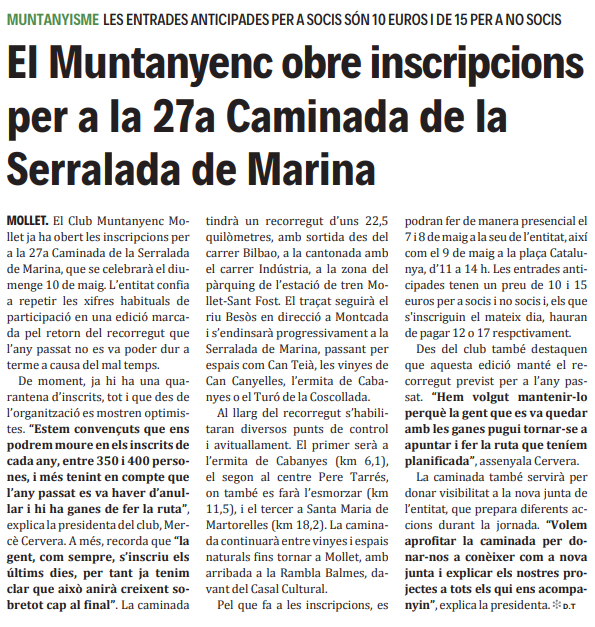 | 10 mai | Diumenge, 10 maig 2026 - Tots 27a Caminada per la Serralada de Marina (Vallès Oriental) |